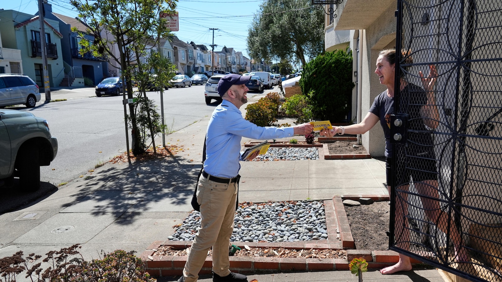 Wearing a blue cap and white sneakers, volunteer Heather Davies slips a recall flier under a door. At another house, she thanks a man for returning his ballot with a yes vote.