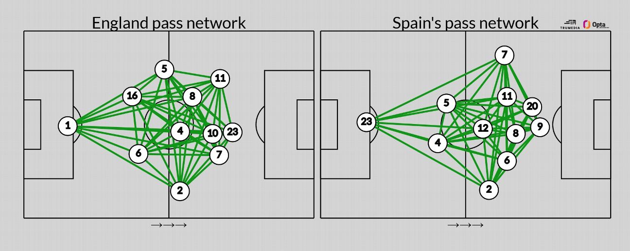 Spain maintain a monopoly on the ball, keeping over 66% of possession in all their games so far. Their midfield is the gold standard and the Barcelona trio of Patri Guijarro, Aitana Bonmatí and Alexia Putellas are all fit and firing. The three combine really well, accounting for 29% of Spain’s total passes during the tournament so far at a completion rate of 86%. They have also created 48 of Spain’s 90 chances.