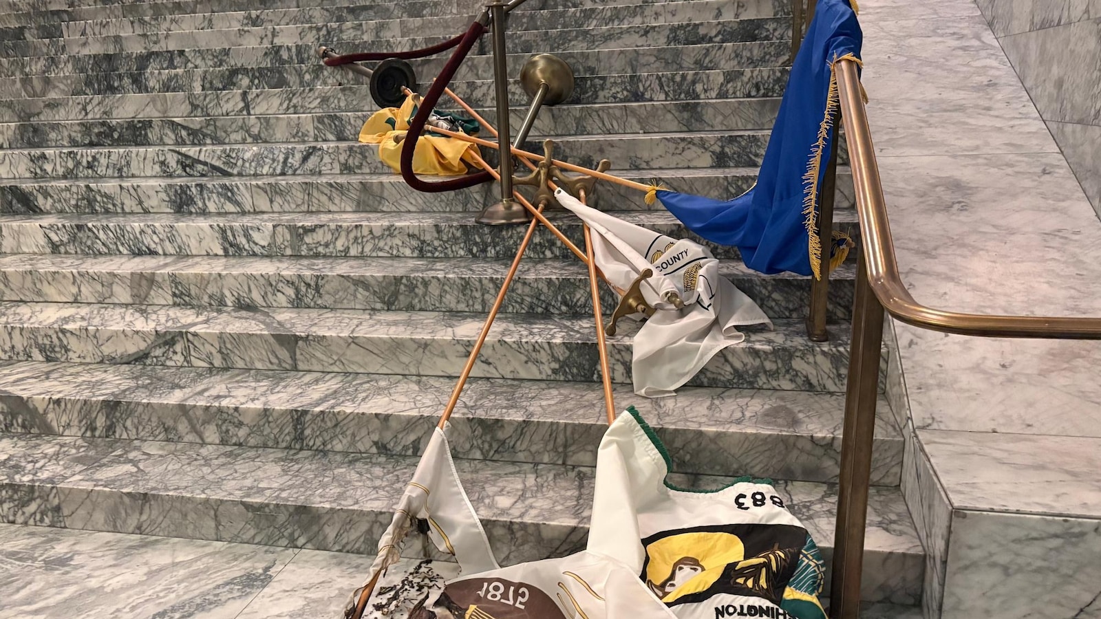 Lt. Gov. Denny Heck said the flags on the side of the Rotunda were knocked over and one was burned.