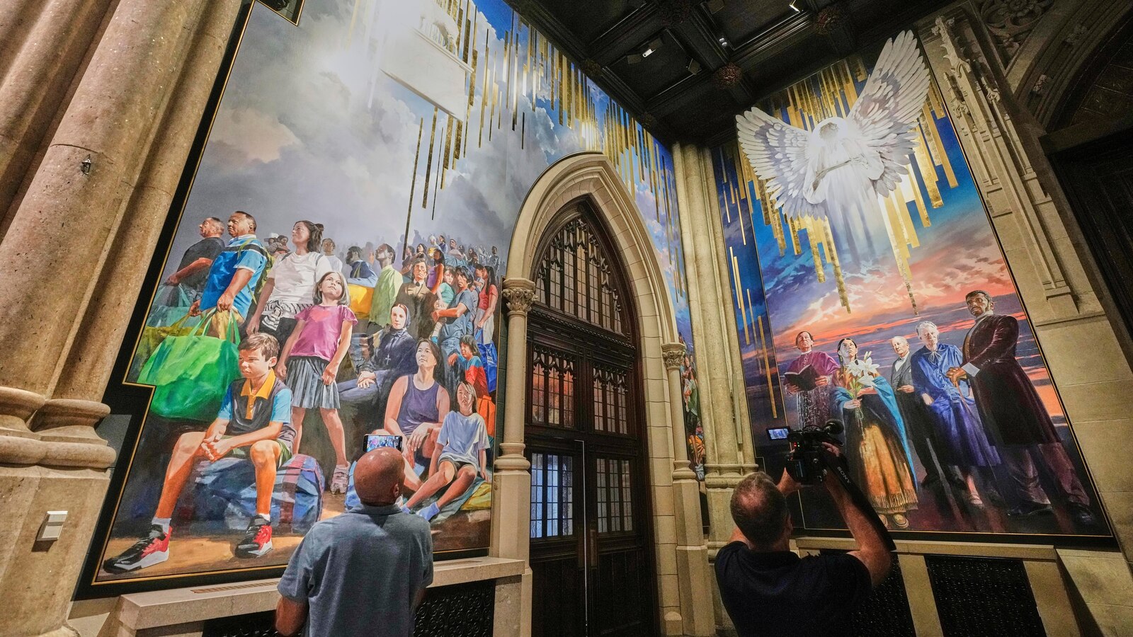 Other scenes show modern-day migrants alongside famous local figures, including journalist and social activist Dorothy Day, Pierre Toussaint, a former slave from Haiti who became a major philanthropist in the city, and former New York Gov. Alfred E. Smith, the first Roman Catholic to receive a major-party nomination for president.
